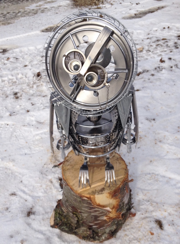 I saw bird feet in a candle holder, a body in the wine bottle cage and his face in the base of a chaffing dish. The corkscrew “wings” are attached so that they would still flap. His face can be turned and tilted at different quizzical angles. His tea ball heart hangs from his head and will spin in his chest when the piece is rotated. It is also a bit of a challenge to use the reflection in his chest to get the tea ball heart set with the exact center hole on the pin tip. He was so fun to create and I wanted movement in the piece to invite “hands on” play to animate him.